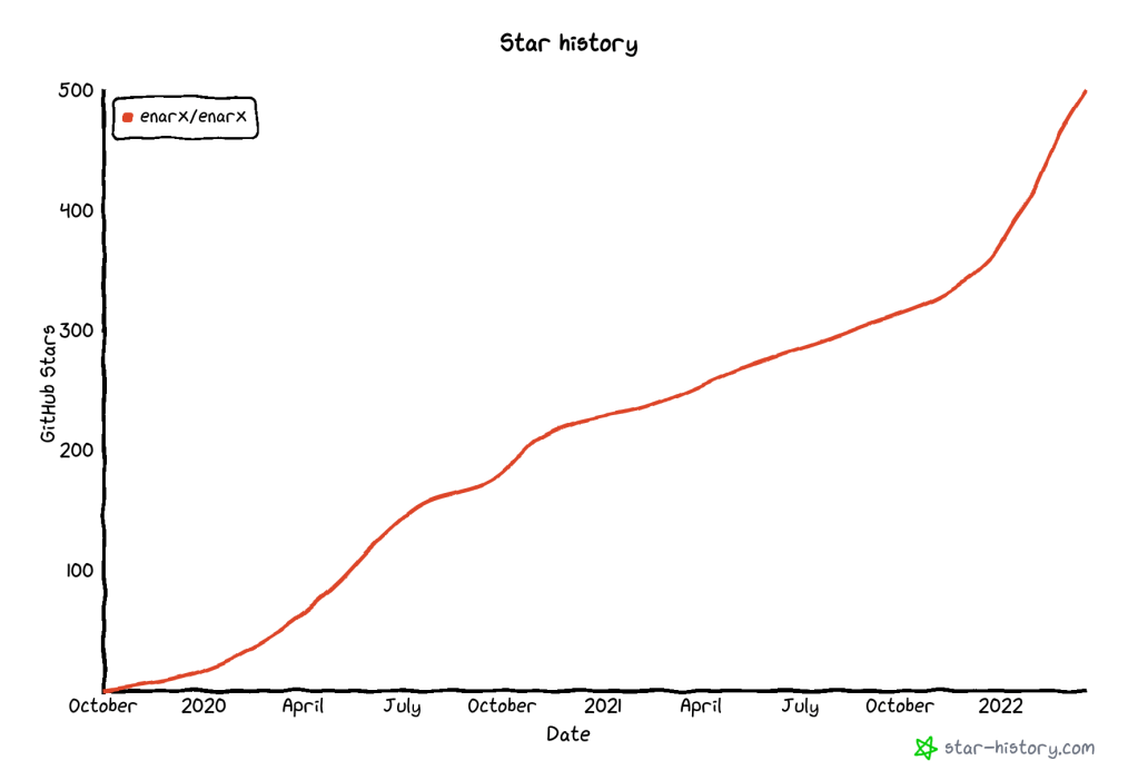 There’s a handy little website which allows you to track stars to a project called GitHub Star History where you can track the addition (or removal!) of stars, and compare other projects. You can check the status of Enarx whenever you’re reading by following this link, but for the purposes of this article, the important question is how did we get to 500? Here’s a graph: